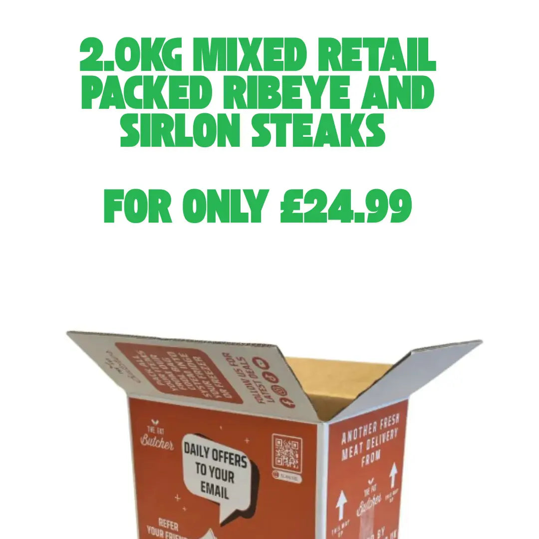 Get over 2kg of our mixed retail packed ribeye and sirloin steaks for only £24.99